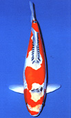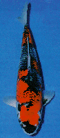 Een rode KOI met zwarte vlekken in het midden van de schubben, op het hoofd mogen er geen zwarte plekken of stippels aanwezig zijn.