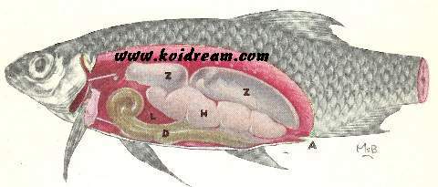 wordt ook bij de vissen onderscheid gemaakt tussen Voor-, Midden- en Einddarm.