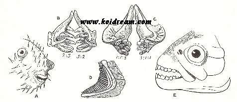 de grijpbek van een karper, D, de zeefbek van een haring. (naar JORDAN en