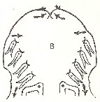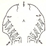 veel is weggelaten. In werkelijkheid staan rechter- en linkerrijen kieuwblaadjes
