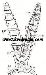 (RP) en rechts de bloedvaten aangegeven, KF-kieuwzeef uitsteeksels, KB-kieuwboog,