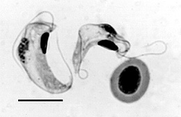 Cryptobia is te herkennen aan zijn licht gebogen lichaam, met flagellen. Deze gebruikt hij om zich voort te bewegen of hangt langs zijn lichaam. Daarnaast is hij niet afhankelijk van vissen als gastheer, maar zijn bijvoorbeeld wormen ook het slachtoffer. Met gevolg dat bijvoorbeeld een besmette bloedzuiger vervolgens de vissen besmetten.