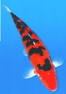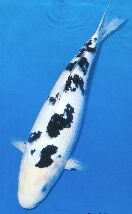 Een BEKKO waarbij de basiskleur wit is en de Koi een zwarte vlek(ken) heeft, het wit moet echt zo sneeuwwit mogelijk zijn, op de kop waar de huid dunner is kan een gele gloed ontstaan dit is echter niet optimaal, maar er zijn al SHIRO BEKKO`S geweest die in de prijzen vielen die dit hadden.