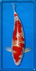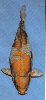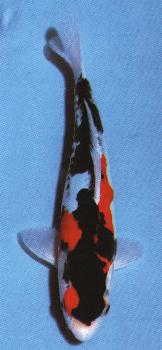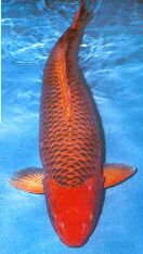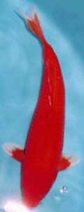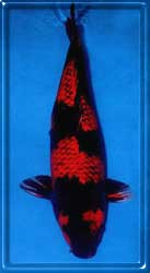 Een rode KOI met zwarte vlekken in het midden van de schubben, op het hoofd mogen er geen zwarte plekken of stippels aanwezig zijn.