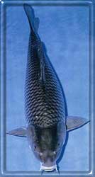 Een schubloze groenige Koi, soms hebben ze witte of zwarte schubben op de rug. (zeldzaam).