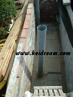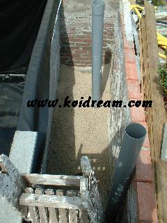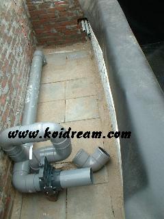 Toen het leggen klaar was met de stenen, kon ik mooi de 2 buizen(110 mm) van de bodem drains afzagen en deze op elkaar aansluiten. En heb er een afsluiter tussen geplaatst, immers als er iets met filter mocht zijn of ik wil wat gaan aanpassen of wat dan ook??? Dan is het gewoon een kwestie van de schuif dicht gooien. Want de rest van buizen systeem wordt zoveel mogelijk met koppelstukken gewerkt waar een rubberen ring inzit.