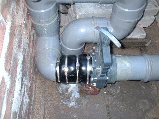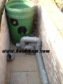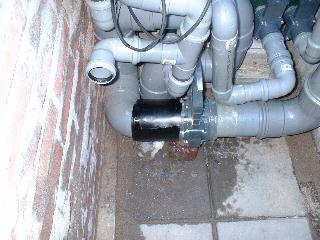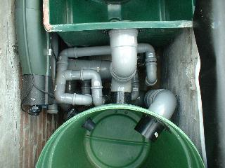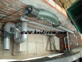 Zie hier de koppeling van vortex naar de 5 kamerfilter toe! Daarnaast zie je ook kleinere buizen lopen, dit is als ik het filter een keer leeg wil leeg laten lopen. Tja was nogal een kleine ruimte, dus moest creatief te werk! Daarnaast wilde ik bij de grote buizen zo min mogelijk bochten etc. Zodat de stroming optimaal blijft, immers daar gaat het om.