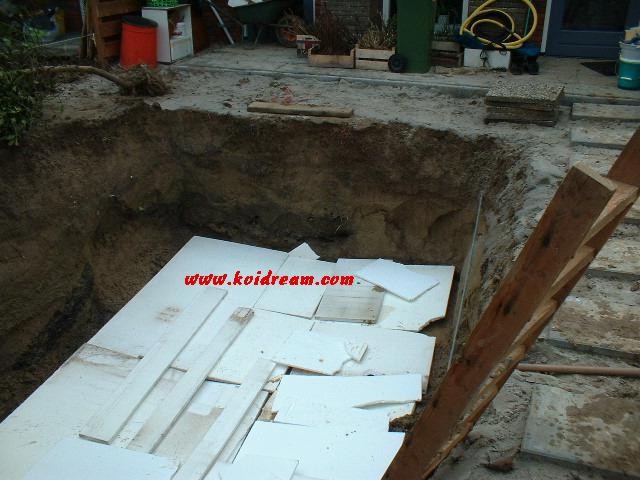 Na een goede regenperiode, was het grondwater gestegen! Met nadeel dat het behoorlijk modderig was geworden in het gat! Dus het werd pompen geblazen! Nadat het gat langzaam aan redelijk droog werd gelegd, zoog ik toch wel erg diep weg met mijn laarzen! En had zoiets van . Hoe moet deze moeras nu een koivijver worden??? Gelukkig had ik van het oude huis een hoop piepschuimplaten over! En dacht laat ik de platen er neer leggen. Met vervolgens klein laagje grondt er over heen! Immers als je er dan overheen loopt, zak je ook niet zo diep weg, omdat je gewicht dan verdeeld wordt! Ik moet zeggen, het idee werkte. Alleen ik bleef nog wel zitten met de nattigheid, want het was letterlijk en figuurlijk een gevecht tegen water!