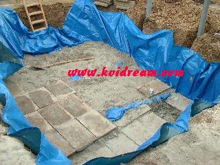Vervolgens heb ik dek zeil gebruikt om over de bodem te leggen, en hebben vervolgens grindtegels (tja over van het oude huis) Op de kop gelegd, en min of meer de bodem bestraat. Dit heb ik een paar dagen zo laten zitten, zodat de grindtegels de boel aan drukte door hun gewicht. Helaas bleek het zeil niet waterdicht, waardoor er toch water doorheen kwam. Met gevolg dat het nog ging vriezen ook! Dus het werd ijs breken!