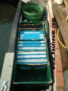 Maar al snel kwam mijn keuze terecht op de Red Devil pomp van Estrad (www.estrad.nl), wel eens waar wat duurder dan een doorsnee pomp die je bij tuincentra tegen komt. Maar het gaat om de betrouwbaarheid, immers een pomp draait zowat continu. Daarnaast mocht een pomp vastlopen door vervuiling dan wordt hij door de ingegoten elektronica binnen 3 seconden uitgeschakeld, waardoor deze niet verbrandt. Indien de pomp dan weer opnieuw ingeschakeld wordt, werkt hij weer normaal. Want je weet maar nooit wat er kan gebeuren in zo`n filter. Ook kan ik deze pomp gebruiken voor ozon installatie. Omdat alle afdichtingen van viton zijn, en daarmee volledig ozonbestendig. Alleen ik zelf heb het niet zo op Ozon. Mocht er iemand zijn die graag met ozon werkt? En mij wilt overhalen? Dan laat het me maar weten, immers ik kan mijn filter heel makkelijk aanpassen.