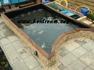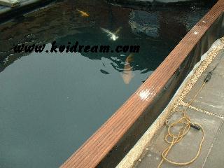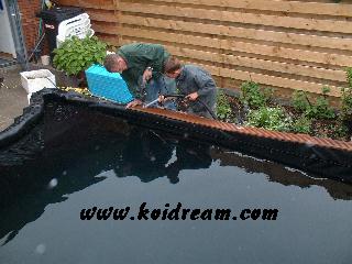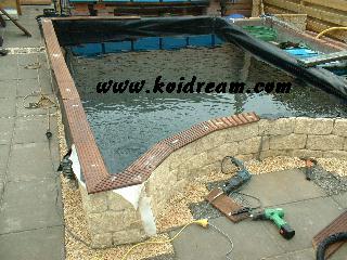 Nadat we het filter in werking hebben gezet en de boel nu aan het draaien is!! En we ook al wat vissen buiten hebben zwemmen. Wordt het tijd om de boel af te gaan werken. Immers de vijver is gevuld en het folie heeft zich gevormd naar de vijver. Er zijn velen mogelijkheden, en mijn keuze is gevallen op dat harde hout!! Daarnaast had ik de mazzel dat een goede kameraad van mij zo aardig is geweest om te zeggen van ik help je wel even . Dus ik had weer wat geluk!